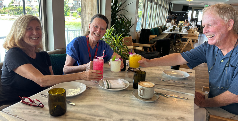 Woman on the Water organized a barbecue with a South Pacific theme recently. Susan Mahler and Nanette Bourne welcomed me with a vibrant lei to wear. The menu featured notes of pineapple flavor. A highlight of the Ladies' Sail evenings is Sharon Weinstock's Grilled Hawaiian Chicken, along with a salmon dish lovingly prepared by our vice commodore, Marie. The table was adorned with a savory cheese selection, a vegan assortment of vegetables like Barbara Berger's Eggplant Hawaiian Style, and a variety of fresh tropical salads, alongside Pam Micchels's shredded pork, wrapped and steamed in leaves. Everything was devoured before the crews from the Thursday night races could arrive to enjoy! I think there was a bit of Daniella Letros's Coconut cake and Mary Rubin's wonderfully citrusy lemon cake. A great incentive to finish the race first!